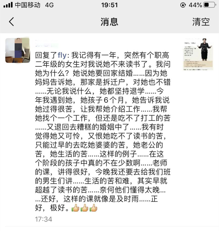 张老师:孩子因回家结婚辍学的事例太多了,还好这样的课就像是及时雨,正好极好。